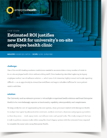 Put AI-enabled, cloud-based technology to work managing occupational health and compliance, and boosting employee engagement across diverse roles, requirements, facilities and geographies. Collaborate in real time — employee to clinician, clinician to supervisor, supervisor to leadership — to add productivity and administrative efficiency to the list of “why Enterprise Health?”