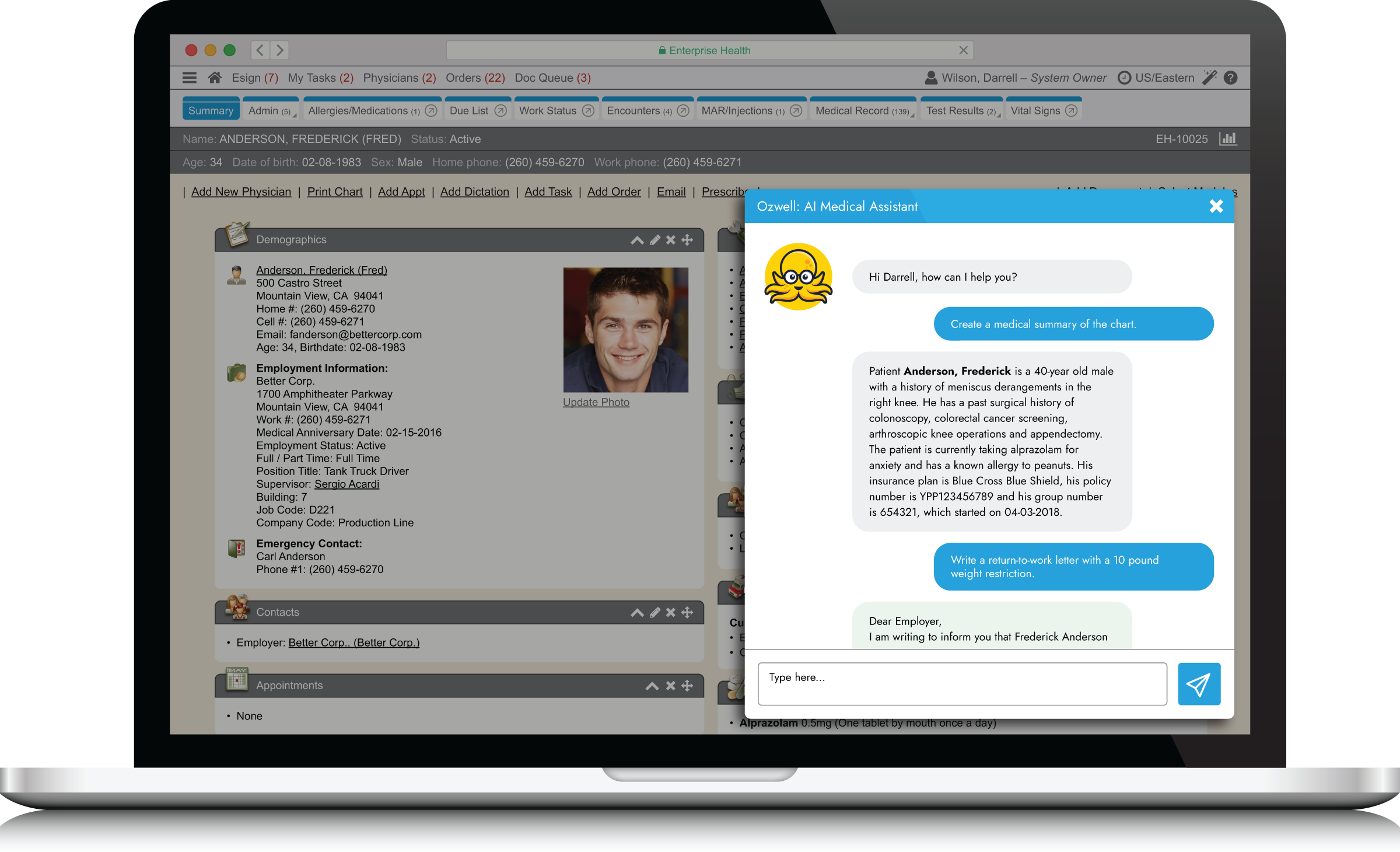 Put the power of certified AI to work in your practice. Ozwell uses AI models including GPT technology based on the OpenAI HIPAA-compliant platform, embedded right into the Enterprise Health solution.